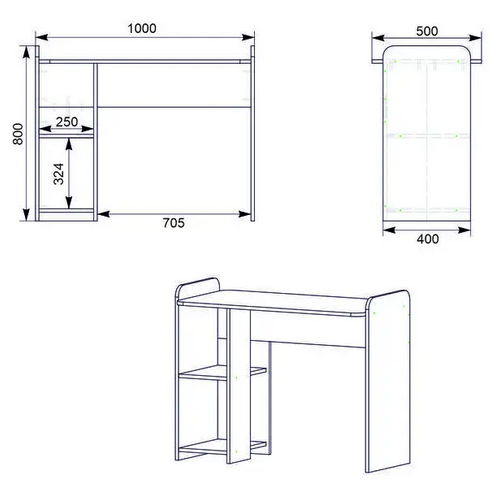 як одна з опор використовується стелаж на дві відкриті полички, стільниці має опори по краях — овальні форми верх ніжки фіксуватиме предмети на столі.
